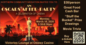 You are invited to Northern Community Mediation’s Oscars After-Party on March 16th from 5:30–8:30 p.m. in Victories Lounge at Odawa Casino. This Hollywood-inspired evening brings the community together to celebrate connection, collaboration, and the art of resolution. Tickets are $30 per person.
